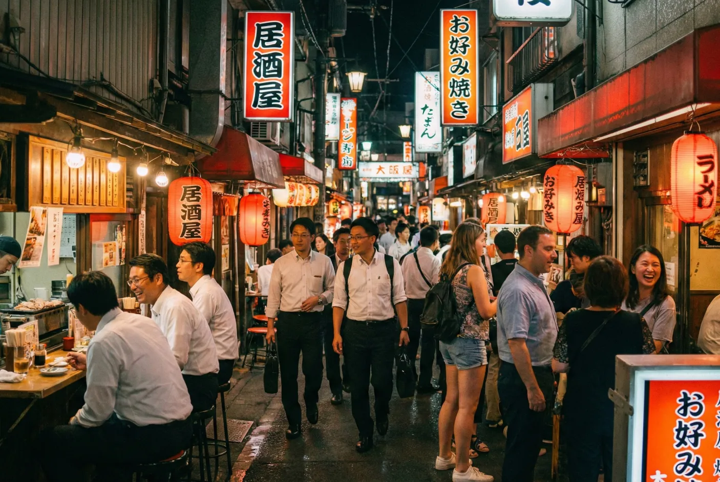 ライトアップされた街並みや、遅くまで賑わう飲食店。